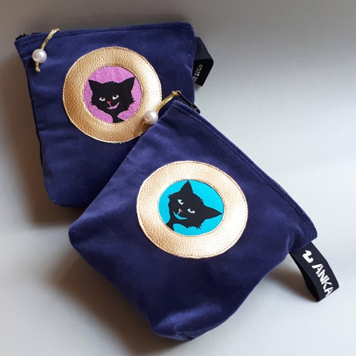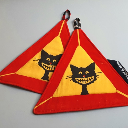 Textilt arbetar jag i stor utsträckning med screentryck på linne och bomullstyger. Ofta blir det lite knäppa och roliga katter och hundar, för det mesta i svartmot starka och klara färger.