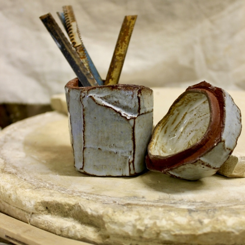 Jag arbetar i stengods, en lera som blir tät efter att den har bränts, gör mina egna glasyrer med allt vad det innebär i tester och experiment. det är både ris o ros när man tömmer en ugn med glaserade föremål. Trots det finns det alltid något som man kan utveckla vidare.