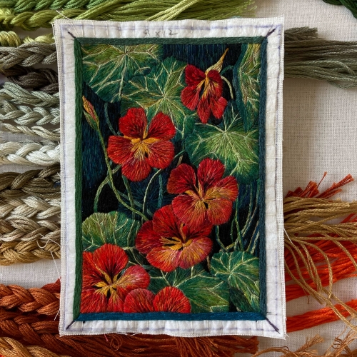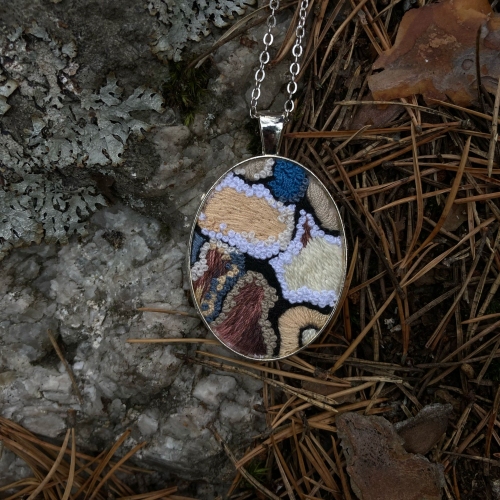 Broderi är ett av mina favoritmedier. Jag älskar hur det förvandlar trådar till invecklade konstverk. För mig är broderi som att måla i slow motion, där varje stygn lägger till djup, textur och känsla till duken. Denna avsiktliga, meditativa process låter mig utforska teman som minne, tid och natur med ett unikt taktilt språk som bara trådar kan förmedla. Den slår en bro mellan traditionellt hantverk och samtidskonst. Varje del är en hyllning till tålamod, precision och konsten att skapa mening genom lager av tråd.